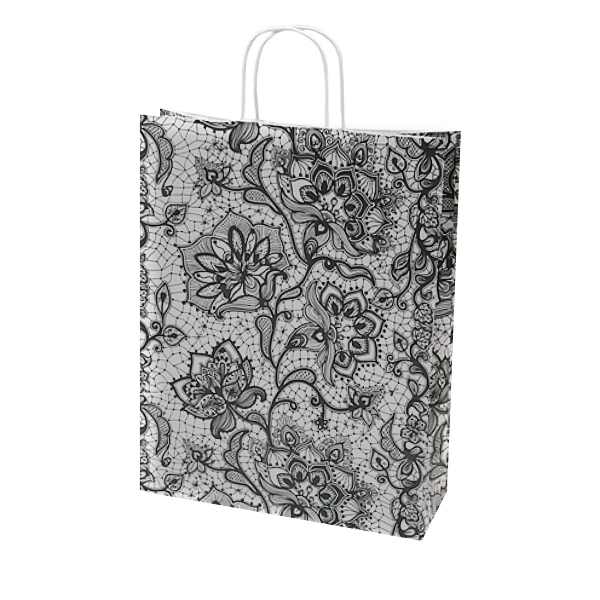 Krafta papīra maisi ar vītiem un plakaniem rokturiem ir ļoti populārs iepakojuma veids dažādās tirdzniecības jomās.